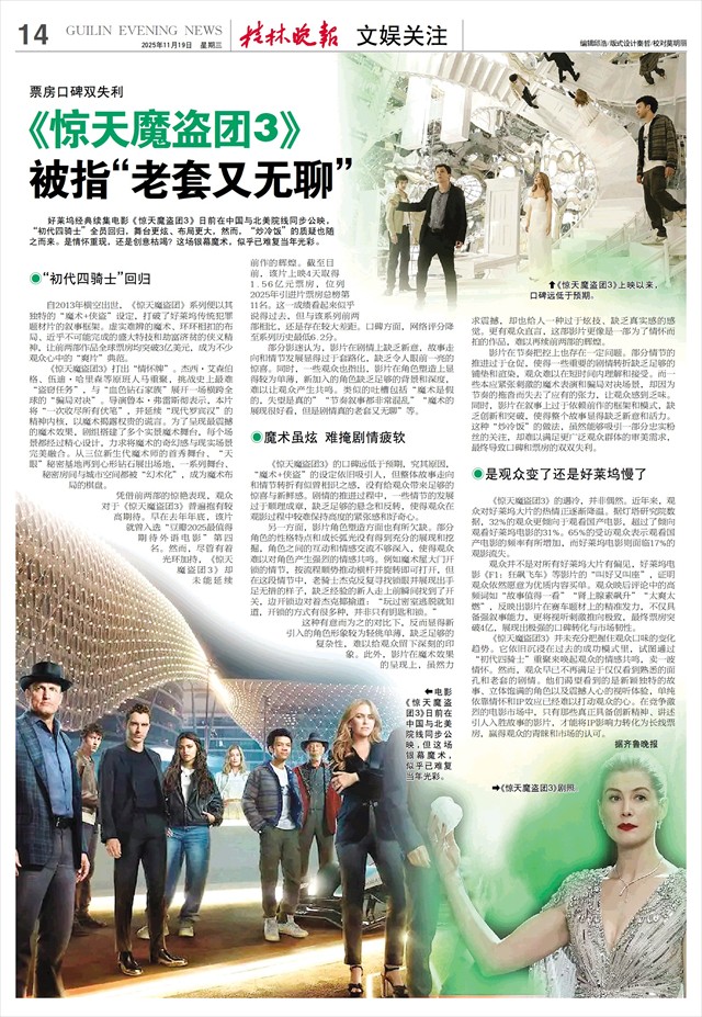 被指“老套又无聊”   好莱坞经典续集电影《惊天魔盗团3》日前在中国与北美院线同步公映,“初代四骑士”全员回归,舞台更炫、布局更大,然而,“炒冷饭”的质疑也随之而来。是情怀重现,还是创意枯竭?这场银幕魔术,似乎已难复当年光彩。