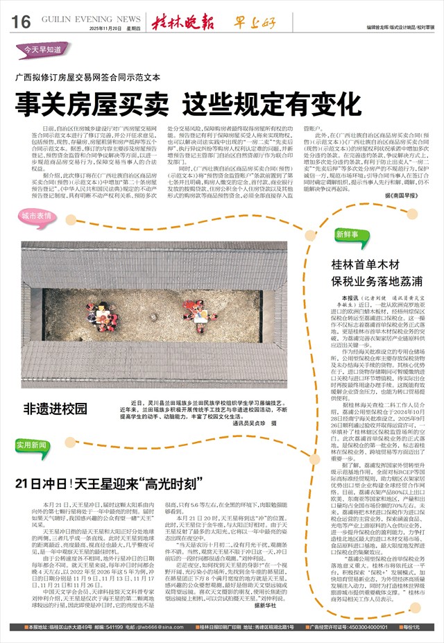 据介绍,此次修订将在《广西壮族自治区商品房买卖合同(预售)(示范文本)》中增加“第二十条房屋预告登记”。《中华人民共和国民法典》规定的不动产预告登记制度,具有明晰不动产权利关系、预防多次处分交易风险,保障购房者最终取得房屋所有权的功能。预告登记有利于保障房屋买受人将来实现物权,也可以解决司法实践中出现的“一房二卖”“先卖后押”、执行异议纠纷等购房人权利认定难的问题,并新增预告登记主管部门自治区自然资源厅作为联合印发部门。