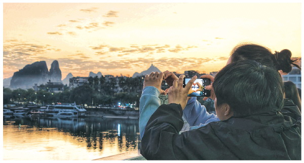 23日傍晚,在漓江桥上,美丽的晚霞吸引了不少市民前来打卡。其中一位市民用手摆出爱心形状,把晚霞“装”进手中,她的同伴则用手机拍下这张有趣的照片。 记者滕嘉 摄