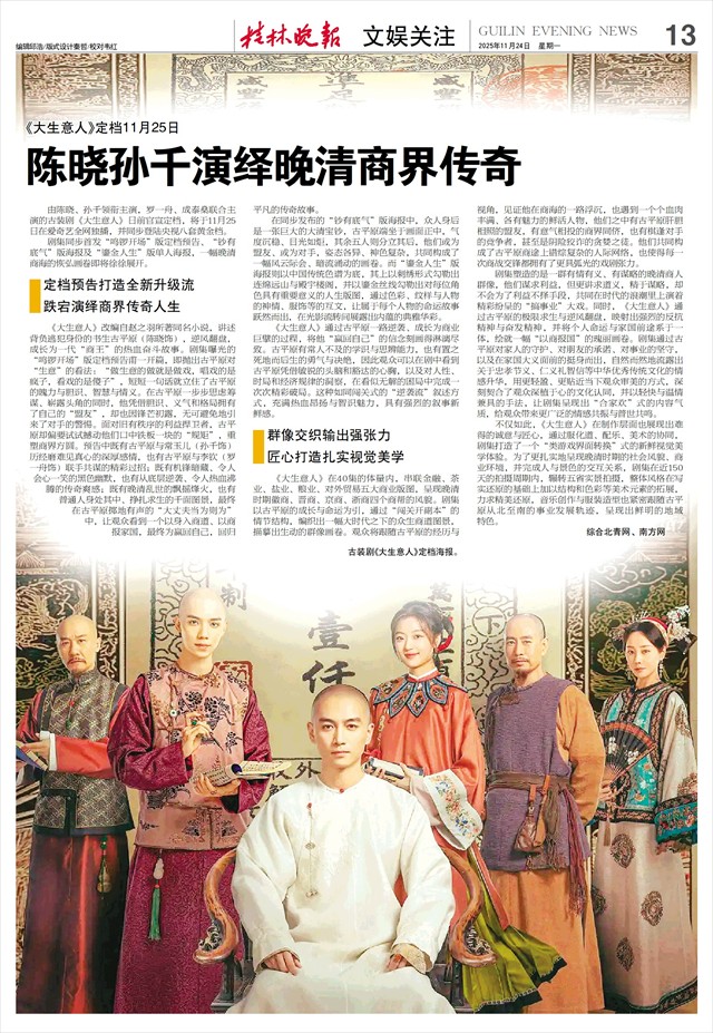 《大生意人》定档11月25日 陈晓孙千演绎晚清商界传奇   由陈晓、孙千领衔主演,罗一舟、成泰燊联合主演的古装剧《大生意人》日前官宣定档,将于11月25日在爱奇艺全网独播,并同步登陆央视八套黄金档。