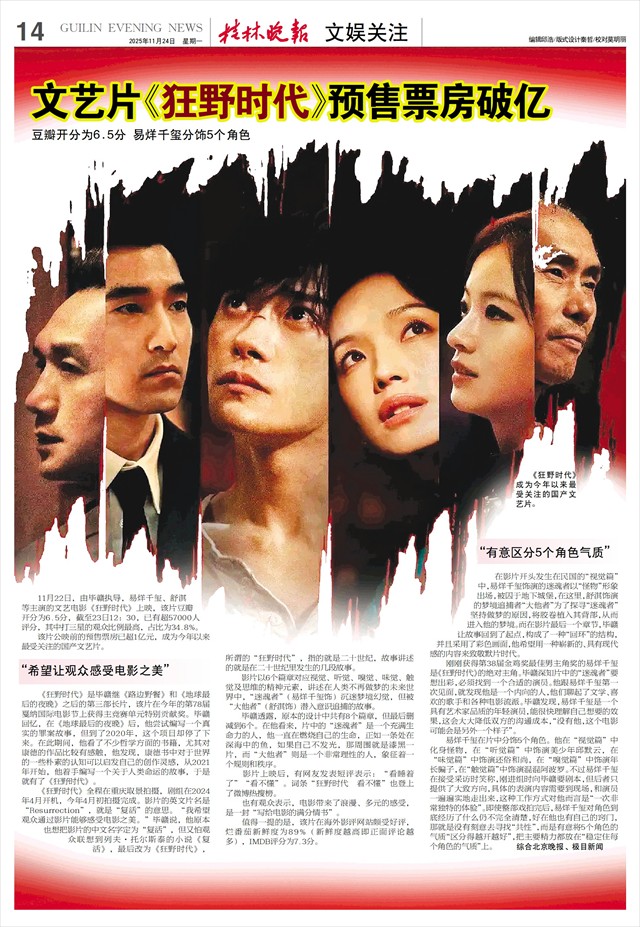 文艺片《狂野时代》预售票房破亿 豆瓣开分为6.5分 易烊千玺分饰5个角色   11月22日,由毕赣执导,易烊千玺、舒淇等主演的文艺电影《狂野时代》上映,该片豆瓣开分为6.5分,截至23日12:30,已有超57000人评分,其中打三星的观众比例最高,占比为34.8%。