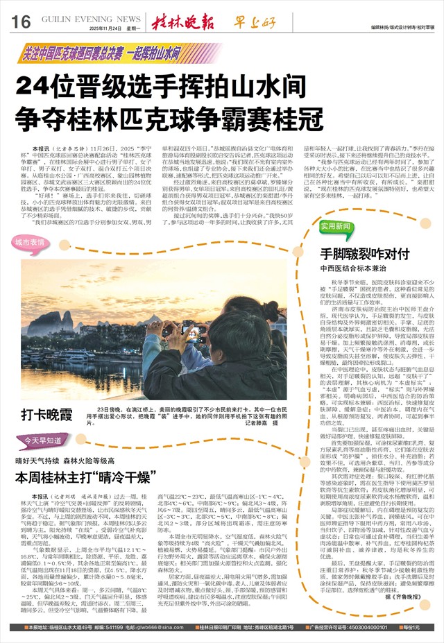 晴好天气持续 森林火险等级高 本周桂林主打“晴冷干燥”   本报讯(记者刘琪 通讯员阳薇)过去一周,桂林天气上演“冷空气突袭+回暖反弹”的反转剧情,强冷空气与晴好暖阳交替登场,让市民深感秋冬天气多变。不过,与上周的剧烈波动不同,本周桂林的天气将趋于稳定。据气象部门预报,本周桂林仍以多云到晴为主,阳光持续“在线”。受弱冷空气补充影响,天气将小幅波动,早晚寒意更浓,昼夜温差大,需重点防范。