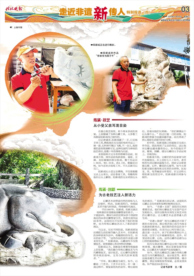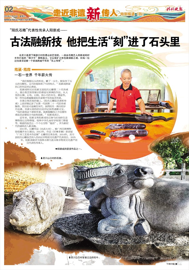 “阳氏石雕”代表性传承人阳新成—— 古法融新技 他把生活“刻”进了石头里   在灵川县潭下镇源口村的愚公刻艺馆前,一座由石雕艺人阳新成耗时半年打造的“孺子牛”静默矗立,它以粗犷之形包裹细腻之魂,向每一位过往者诉说着一个家族跨越千年的“石上传奇”。