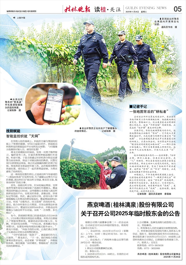 “守护好群众的‘钱袋子’,就是最好的为人民服务。”蒋龙表示,“下一步,我们将结合采收季果农需求变化,动态更新‘护果地图’,升级技防体系,做优做强‘实时调优、智能联动’的立体化防控新格局。”