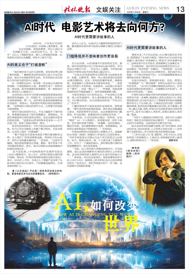 AI时代 电影艺术将去向何方? AI时代更需要讲故事的人   1895年,卢米埃尔兄弟的《火车进站》在银幕上轰然驶来,观众仓皇逃散,那是影像第一次让人误以为世界触手可及。130年后的今天,另一列“火车”正以人工智能的姿态,驶入人类创造的轨道:AI电影所引发的认知颠覆,同样令人措手不及。