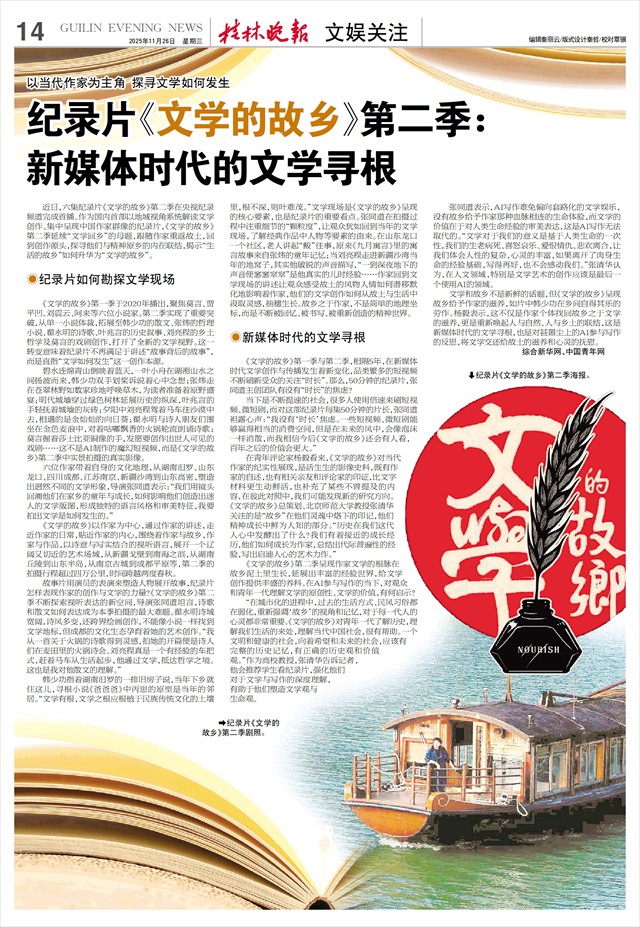 新媒体时代的文学寻根   近日,六集纪录片《文学的故乡》第二季在央视纪录频道完成首播。作为国内首部以地域视角系统解读文学创作、集中呈现中国作家群像的纪录片,《文学的故乡》第二季延续“文学回乡”的母题,跟随作家重返故土,回到创作源头,探寻他们与精神原乡的内在联结,揭示“生活的故乡”如何升华为“文学的故乡”。