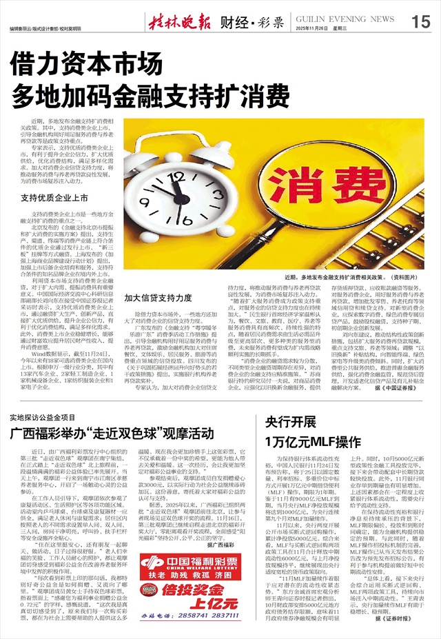 多地加码金融支持扩消费   近期,多地发布金融支持扩消费相关政策。其中,支持消费类企业上市、引导金融机构用好用足服务消费与养老再贷款等是政策支持重点。