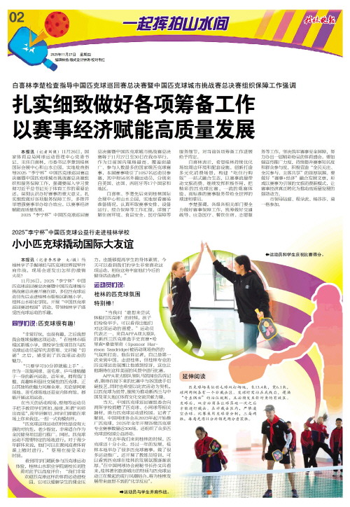 以赛事经济赋能高质量发展   本报讯(记者刘健)11月26日,国家体育总局网球运动管理中心党委书记、主任白喜林,市委书记李楚到桂林国际会展中心和山水公园,实地检查指导2025“李宁杯”中国匹克球巡回赛总决赛暨中国匹克球城市挑战赛总决赛组织和服务保障工作,强调要深入学习贯彻习近平总书记关于体育工作的重要论述,深刻认识办好赛事的重大意义,扎实细致做好各项服务保障工作,多措并举增强赛事举办综合效应,以赛事经济赋能高质量发展。