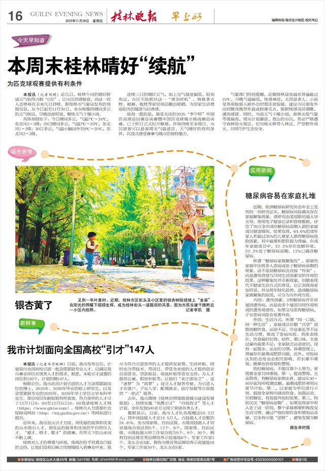 本周末桂林晴好“续航” 为匹克球观赛提供有利条件   本报讯(记者刘琪)近几日,桂林午间的晴好舒适天气始终占据“C位”,让市民倍感惬意,而这一宜人态势将在未来几日持续。据桂林市气象局发布的预报信息,从今日起至11月30日,全市将维持晴间多云的天气格局,早晚凉意明显,整体天气干燥少雨。