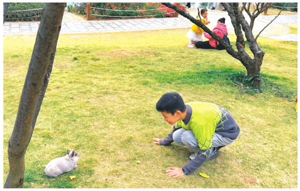 近日,穿山公园内的草坪成为了市民休闲放松的好去处,一位市民带去的宠物兔子成为了孩子们特别的“玩伴”。 记者周子琪 摄