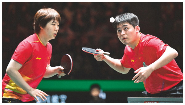 2日,中国队组合蒯曼/林诗栋(右)在混双比赛中。 新华社发