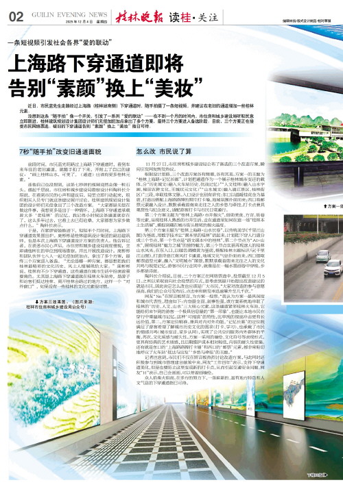 在挖掘这条新闻的过程中,许多细节有如开凿金矿一般,慢慢显现:市民提议得到了有关部门的重视与立即响应;所有参与方不计报酬,多出于“老桂林”对家乡故土的情怀;从提建议到票决设计方案,全程体现出了市民的主人翁地位,真正践行了“人民城市人民建”的理念。可以说,上海路下穿通道改造,是政府“闻声而动”、市民“踊跃参与”、设计院“公益奉献”的一个政民互动的温暖故事,也是一份城市基层治理全过程人民民主的鲜活样本。