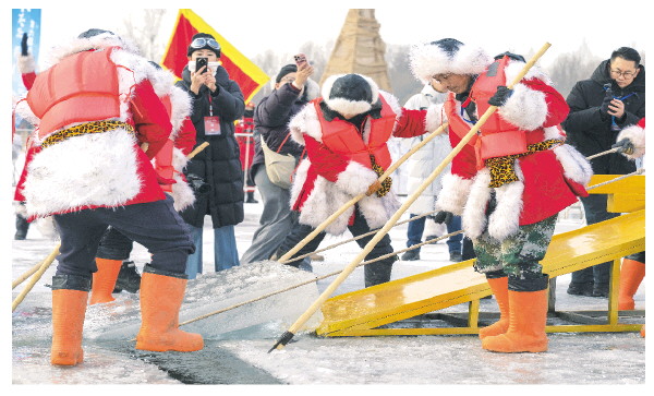 12月7日,第六届哈尔滨采冰节在松花江畔开幕,精彩的采冰仪式和民俗体验互动吸引众多市民和游客参与其中,标志“冰城”哈尔滨进入采冰季。图为活动现场,采冰汉子在采头冰。 新华社发