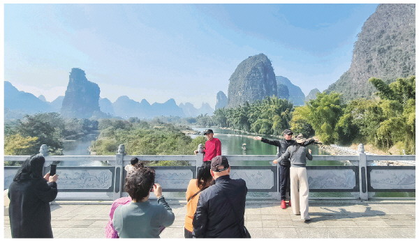 近段时间,桂林的天气阴晴不定。12月6日,在阳朔县览胜桥,市民游客“抓”住晴好天气出游,用镜头拍下遇龙河的山水美景。