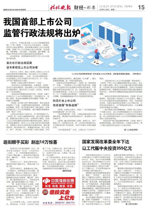 监管行政法规将出炉   12月5日,中国证监会就《上市公司监督管理条例》(下称《条例》)向社会公开征求意见。《条例》首次在行政法规层面,设专章重点规范上市公司治理问题,明确了从上市后到退市前公司治理、信息披露、并购重组、分红回购、市值管理、破产重整、股票退市等各项与资本市场活动相关的监管要求。