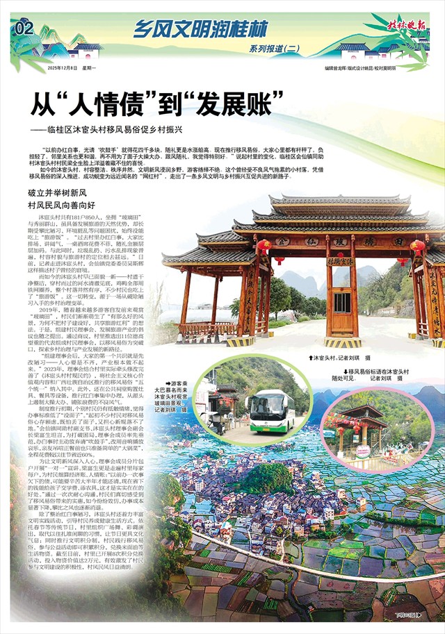 从“人情债”到“发展账” ——临桂区沐宦头村移风易俗促乡村振兴   “以前办红白事,光请‘吹鼓手’就得花四千多块,随礼更是水涨船高。现在推行移风易俗,大家心里都有杆秤了,负担轻了,邻里关系也更和谐,再不用为了面子大操大办、跟风随礼,我觉得特别好。”说起村里的变化,临桂区会仙镇同助村沐宦头村村民梁全生脸上洋溢着藏不住的喜悦。