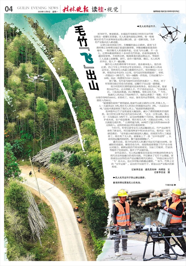 毛竹“飞”出山   初冬时节,寒意渐浓,永福县百寿镇双合村的万亩竹林呈现出一派繁忙的景象。无人机轰鸣着掠过林梢,将一根根粗长的毛竹从密林深处运抵山脚公路。这一创新实践,为乡村产业振兴注入新动能。