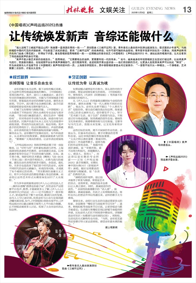 《中国唱将》《声鸣远扬2025》热播 让传统焕发新声 音综还能做什么   “谁人说喝了三碗就不能过山冈?我偏要一壶清酒乐得闯一闯……”原创歌曲《三碗不过冈》里,青年音乐人桑田把中阮弹出摇滚张力。歌词里的少年意气,与婉转唱腔中隐约可见的评剧韵律,不仅彰显了武松的豪迈,更将“三碗不过冈”的经典桥段,化作可感可触的热血现场。青年歌手危晋宇则在另一方舞台,用美声诠释周杰伦热门金曲《青花瓷》,听得台下评委、著名歌唱家殷秀梅眼前一亮……近期播出的音乐综艺《中国唱将》《声鸣远扬2025》中,诸如此类的唱演片段,让大众看到了传统焕发新声的多元可能。