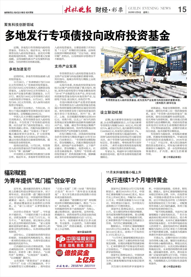 聚焦科技创新领域 多地发行专项债投向政府投资基金   近期,多地发行专项债投向政府投资基金。专家认为,临近年末,将专项债资金投入政府投资基金,是优化中期财政规划的体现,有助于服务重大发展战略,支持战略性新兴产业发展和科技创新,为经济增长培育新动能。