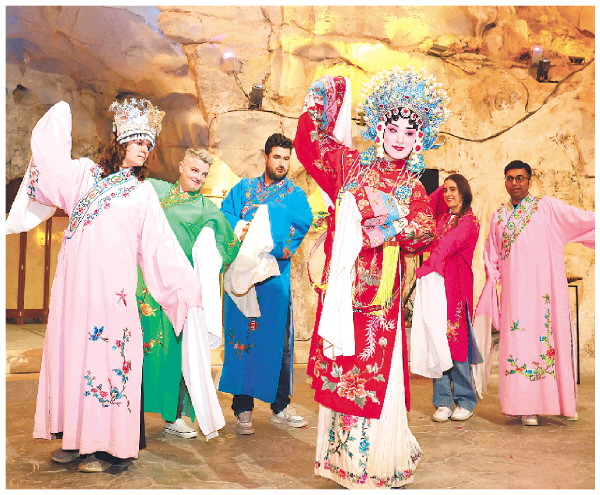 近日,“下一站·广西”引客入桂主题文旅活动在穿山岩洞咖啡举行,桂林市非遗中心为媒体以及来自美国、俄罗斯、英国、墨西哥、巴基斯坦等国的文旅博主们带来一场内容丰富的桂林非遗主题展演。图为外国文旅博主们被桂剧吸引,纷纷在现场“沉浸式”感受中国传统戏曲的魅力。 记者李凯 摄