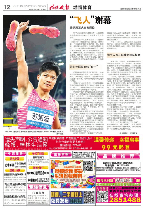 今年11月20日,苏炳添在十五运会的男子4×100米接力决赛中,跑完了自己运动员生涯的最后100米,他和广东队的队友获得第四名。