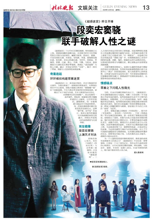 联手破解人性之谜   《超感迷宫》于12月9日在腾讯视频、咪咕视频正式上线,该剧是由腾讯视频出品,北京锦书拾年文化传媒有限公司联合出品制作,臧溪川执导,段奕宏、窦骁、王佳佳领衔主演,吕星辰、安悦溪、李晟、胡海锋友情出演,张兆辉、刘金山特邀出演,马吟吟、郑湫泓、李逸男、郑楚一主演,蔡心、丹琳、牛飘、马柏全、赵润南联合主演的双生博弈罪案剧。该剧以“善恶镜像”为核心主题,通过一对命运交织的“兄弟”,展开一段关于罪案、情感与人性抉择的深刻叙事。