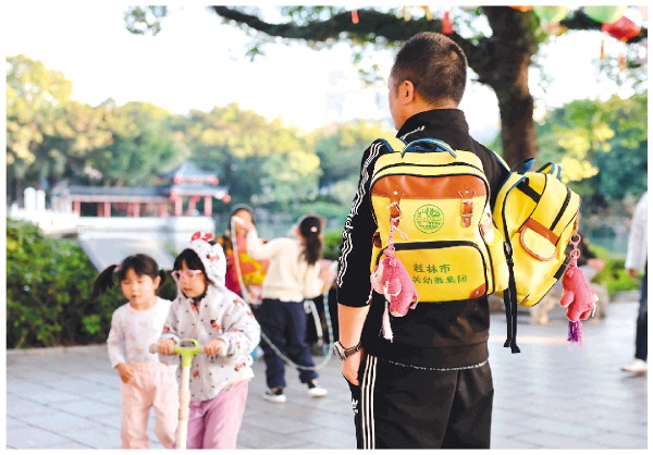 近日,在榕湖景区,孩子们放学后欢乐地玩耍。一位家长肩上背着两个书包,耐心地在一旁等待,让孩子尽情享受这属于他们的美好时光。 记者李凯 摄