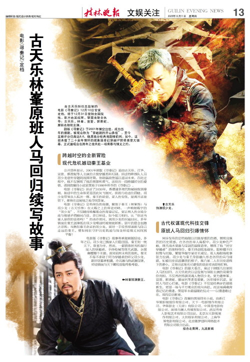 电影《寻秦记》定档 古天乐林峯原班人马回归续写故事   由古天乐担任总监制的电影《寻秦记》12月10日官宣定档,将于12月31日登陆全国院线。影片由吴炫辉、黎震龙联合执导;古天乐、林峯、宣萱、郭羡妮、滕丽名领衔主演。