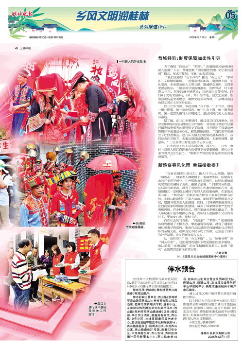 “我们主要以‘三项举措’推动‘两边走’‘零彩礼’文明婚俗新风:一是制定村规新规,将宴席上限、彩礼限高、孝老爱亲纳入文明共识,既减群众负担,又育孝老爱亲新风;二是示范引领监督落实,发挥党员、村干部带头作用,同步监督举措落实;三是深化宣传引导,以136个文明实践中心(所、站)为阵地,借文艺表演、瑶语宣讲传递文明理念,助推文明乡风养成。”恭城瑶族自治县文明办主任何彬宾说。