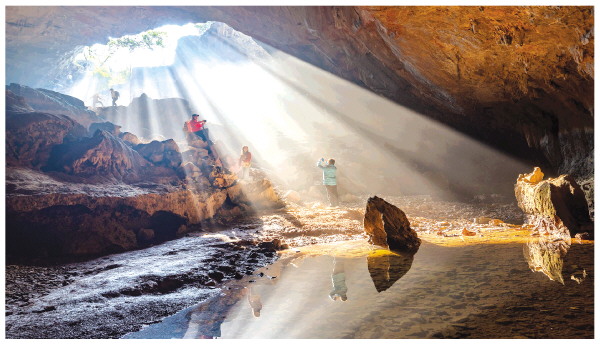 近日,在广西桂林国家森林公园的天然岩洞中,户外爱好者正在追逐“光影盛宴”。