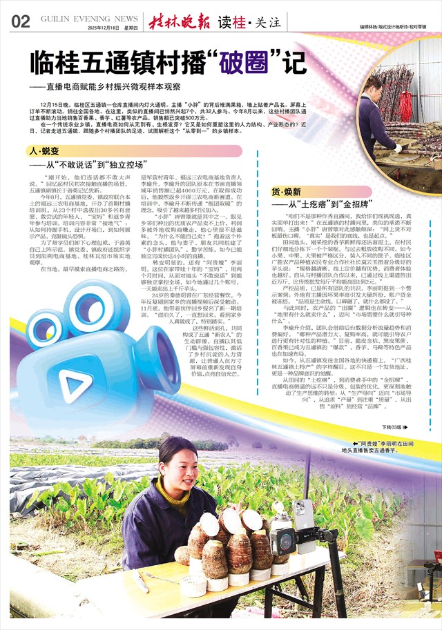 田间地头,刚采挖的香芋新鲜得还沾着泥土,在村民们仔细地分拣下一个个装框。与过去粗放收购不同,如今小果、中果、大果被严格区分,装入不同的筐子。临桂区广胜农产品种植农民专业合作社社长莫云玉指着分级好的芋头说:“规格越清晰,线上定价越有优势,消费者体验也越好。自从与村播团队合作以来,已通过线上渠道售出近万斤,比传统批发每斤平均能高出1到2元。”