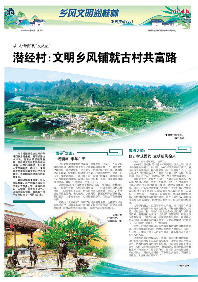 从不堪重负的“人情枷锁”,到驱动发展的“文明引擎”,潜经村以一场深刻的乡风革命,唤醒了沉睡的古村资源,让漓江畔这颗明珠,闪耀出文明与发展的璀璨光芒。潜经村的蜕变,生动印证了乡风文明是乡村振兴的灵魂,而产业兴旺,为文明新风扎根乡村、滋养乡风提供了坚实根基。