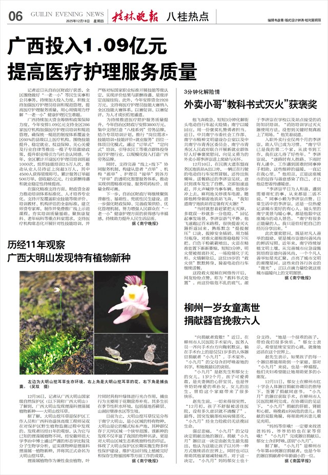 广西持续加大资金筹措和政策保障力度,今年安排1.09亿元支持全区286家医疗机构加强医疗护理员培训和规范管理,确保统一规范的制度体系覆盖全区60%的县级以上医疗机构。围绕技能提升、稳定就业、权益保障、关心关爱及行业自律等推出一揽子专项激励政策,提升职业吸引力与社会认同感。今年,全区累计开设医疗护理员培训班超1000次,组织技能培训2.5万人次,推动从业人员持证上岗超3万人,其中4500人获得星级称号,累计服务订单超500万单,创收超5亿元,行业薪酬待遇和就业稳定性持续提高。