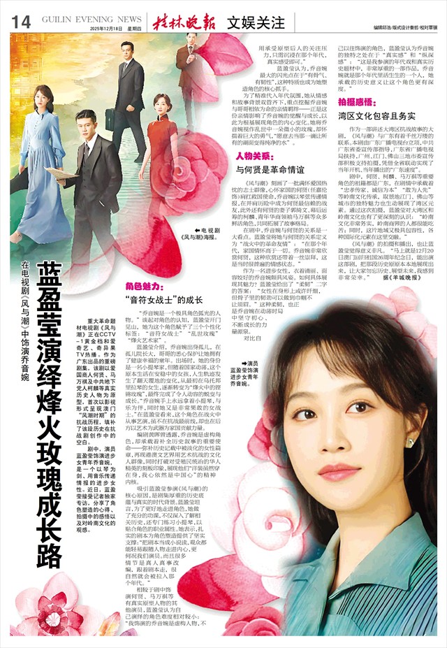 剧中,演员蓝盈莹饰演进步女青年乔音婉,是一个以琴为剑、用音乐传递情报的进步女性。近日,蓝盈莹接受记者独家专访,分享了角色塑造的心得、拍摄中的感悟以及对岭南文化的观感。