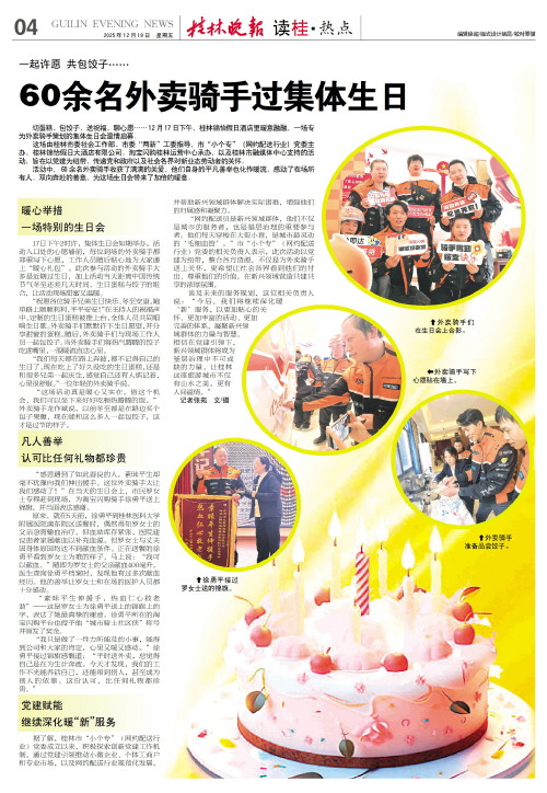 一起许愿 共包饺子…… 60余名外卖骑手过集体生日   切蛋糕、包饺子、送祝福、聊心愿……12月17日下午,桂林锦怡假日酒店里暖意融融,一场专为外卖骑手策划的集体生日会温情启幕。