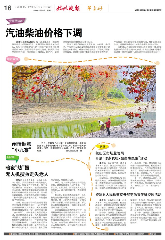 无人机搜救走失老人   本报讯(记者周子琪 通讯员江康杰)近日,灵川县潮田乡一名高龄老人傍晚走失,家属多方寻找未果。由于当地山林茂密、夜色深沉,地面搜救面临巨大困难。桂林投资集团低空运营公司接报后迅速启动应急联动机制,第一时间赶赴现场,利用搭载热成像技术的无人机成功锁定走失老人位置,为救援赢得了宝贵时间。