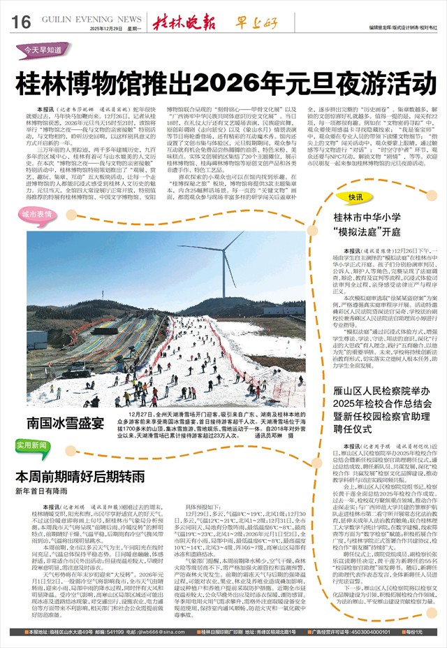 喜欢探索的小观众也可以在馆内找到乐趣。在“桂博探秘之旅”板块,博物馆将提供3款主题集章本,内含25幅鲜活场景。每一页的“关键文物”画面,都需观众参与现场丰富多样的研学闯关后盖章补全,逐步拼出完整的“历史画卷”。集章数越多,解锁的文创惊喜好礼就越多。值得一提的是,闯关有22项,每一项都很有趣。例如在“文物密码寻踪”中,观众要使用感温卡寻找隐藏线索;“我是鉴宝师”中,观众要在专业人员的带领下读懂文物细节;“指尖上的文物”闯关活动中,观众要蒙上眼睛,通过触感等与文物进行“对话”;“时空守护者”环节,观众还要与NPC互动,解锁文物“剧情”,等等。欢迎市民朋友一起来参加桂林博物馆的元旦夜游活动。