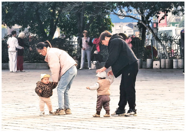 28日上午,在甲天下广场,两位家长分别带着小朋友在暖阳下练习走路,一起感受冬日的温暖。 记者滕嘉 摄