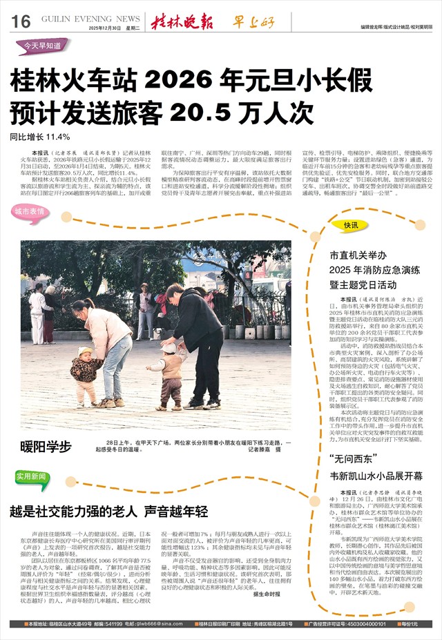 预计发送旅客20.5万人次 同比增长11.4%   本报讯(记者苏展 通讯员郑长贤)记者从桂林火车站获悉,2026年铁路元旦小长假运输于2025年12月31日启动,至2026年1月4日结束,为期5天。桂林火车站预计发送旅客20.5万人次,同比增长11.4%。