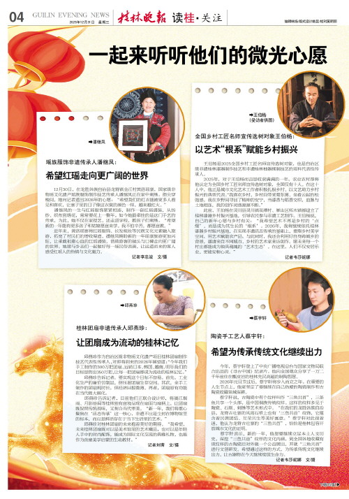 此前,王伯杨在灵川县灵川镇双潭村、雁山区柘木镇都建立了桂林漆器乡村振兴基地,引导农民参与非遗工艺制作。王伯杨说,自己的新年心愿与乡村有关:“我希望艺术不再是乡村的‘点缀’,而是成为其生长的‘根系’。2026年,我将继续依托桂林漆器乡村振兴基地,在实现非遗活态传承的基础上,重塑乡村美学空间,用艺术赋能农产品。与此同时,我还会利用好自身跨城乡的背景,邀请来自不同城市、乡村的艺术家来访创作。愿未来每一个村庄都能成为独具魂魄的‘艺术生态’。在这里,人们不仅安居乐业,更能安顿心灵。”