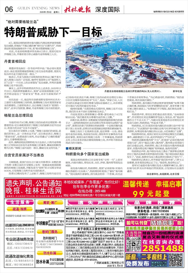 “绝对需要格陵兰岛” 特朗普威胁下一目标   4日,美国总统特朗普对委内瑞拉代理总统罗德里格斯发出威胁,称她如“不做正确的事”将付出“沉重代价”。特朗普还称美国或继续对外干预,美“绝对需要格陵兰岛”。