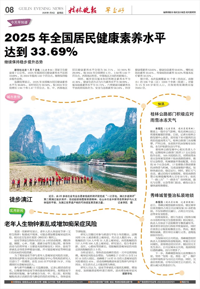 达到33.69% 继续保持稳步提升态势   新华社北京1月7日电(记者李恒)国家卫生健康委7日公布,2025年我国居民健康素养水平达到33.69%,比2024年提高1.82个百分点,继续保持稳步提升态势。