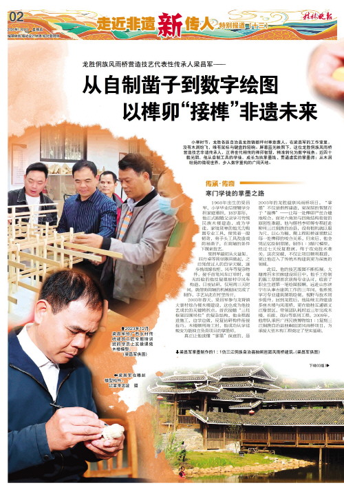 以榫卯“接榫”非遗未来   小寒时节,龙胜各族自治县龙胜镇都坪村寒意袭人。在梁昌军的工作室里,没有木屑纷飞,唯有鼠标与键盘的轻响。屏幕蓝光映照下,这位龙胜侗族风雨桥营造技艺非遗传承人,正将世代相传的榫卯智慧,精准转化为数字线条。近四十载光阴,他从自制工具的学徒,成长为执掌墨线、贯通虚实的掌墨师;从木屑纷扬的微观世界,步入数字重构的广阔天地。
