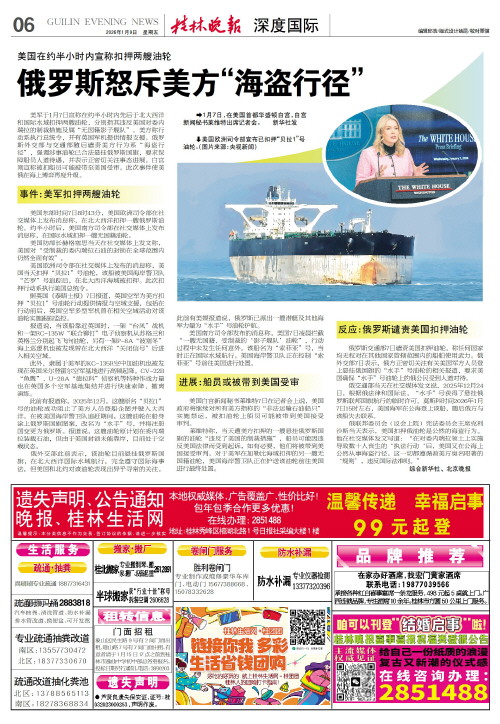 美国在约半小时内宣称扣押两艘油轮 俄罗斯怒斥美方“海盗行径”   美军于1月7日宣称在约半小时内先后于北大西洋和国际水域扣押两艘油轮,分别指其违反美国对委内瑞拉的制裁措施及属“无国籍影子舰队”。美方称行动系执行总统令,并有英国军机提供情报支援。俄罗斯外交部与交通部随后谴责美方行为系“海盗行径”,强调涉事油轮已合法悬挂俄罗斯国旗,要求保障船员人道待遇,并表示正密切关注事态进展。白宫则宣称被扣船员可能被带至美国受审。此次事件使美俄在海上博弈再度升级。