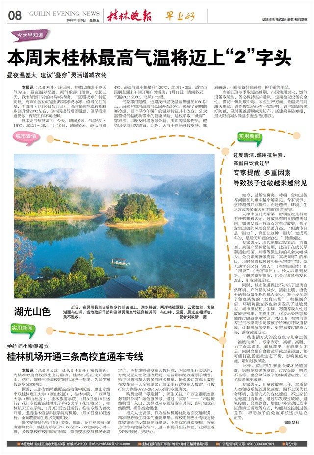 本周末桂林最高气温将迈上“2”字头 昼夜温差大 建议“叠穿”灵活增减衣物   本报讯(记者刘琪)连日来,桂林以晴朗干冷天气为主,昼夜温差显著。据气象部门预测,今起三天,我市晴朗干冷的格局将持续,“昼暖夜寒”特征明显,高寒山区仍可能出现霜冻或冰冻。值得关注的是,本周末(1月10日至11日),全市最高气温有望稳步回升至20℃左右,为市民出行增添暖意,但早晚寒意仍浓,保暖工作不可松懈。
