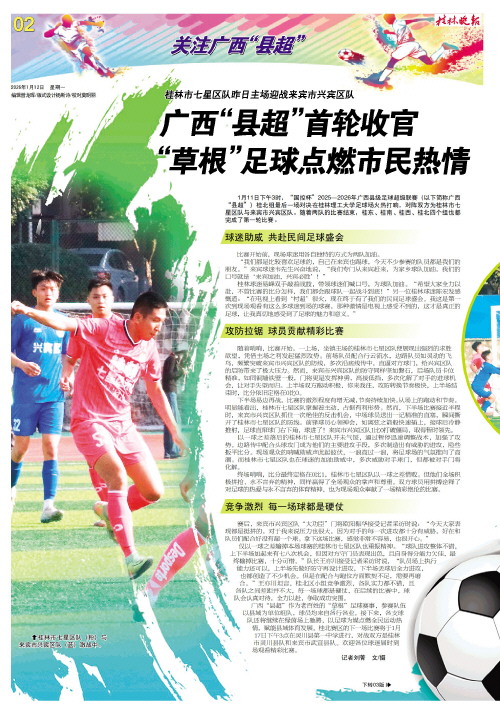 “草根”足球点燃市民热情   1月11日下午3时,“国控杯”2025—2026年广西县级足球超级联赛(以下简称广西“县超”)桂北组最后一场对决在桂林理工大学足球场火热打响,对阵双方为桂林市七星区队与来宾市兴宾区队。随着两队的比赛结束,桂东、桂南、桂西、桂北四个组也都完成了第一轮比赛。