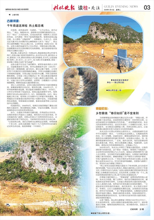 记者了解到,侯山背古道修复工程预计2027年12月完工。在未来的两年里,这条古道将在建设者的精心呵护下,逐步恢复往日容颜,继续诉说桂林的历史,成为维系乡愁、连接古今的文化纽带。