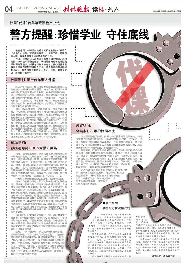 雁山警方提醒:广大学生请务必珍惜宝贵的求学时光,自觉抵制任何形式的“代课”、“代考”、“代写”等非法服务。这些行为一经查实,将面临校纪校规的严肃处理,甚至可能记入个人诚信档案,对今后升学、就业造成长远负面影响。切勿因一时便利或懈怠,而触碰学术诚信的底线,葬送自己的前程。