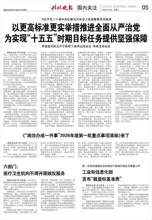 中国共产党第二十届中央纪律检查委员会第五次全体会议于1月12日在北京开幕。中央纪律检查委员会常务委员会主持会议。12日下午李希代表中央纪律检查委员会常务委员会作题为《以更高标准、更实举措推进全面从严治党,为实现“十五五”时期目标任务提供坚强保障》的工作报告。
