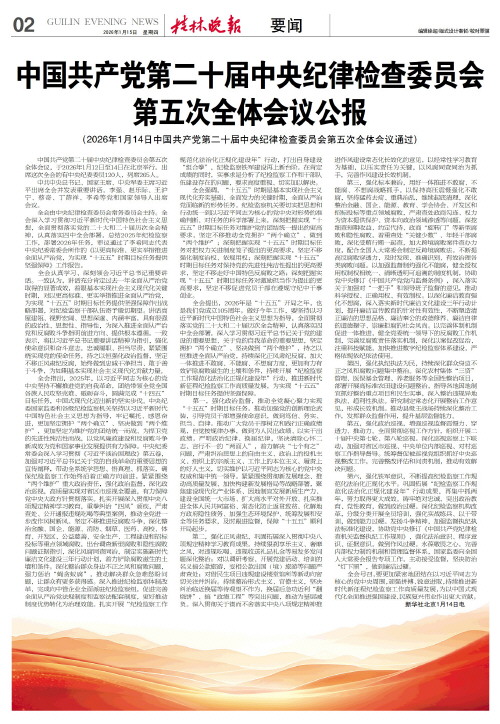 第五次全体会议公报 (2026年1月14日中国共产党第二十届中央纪律检查委员会第五次全体会议通过)   中国共产党第二十届中央纪律检查委员会第五次全体会议,于2026年1月12日至14日在北京举行。出席这次全会的有中央纪委委员120人,列席265人。